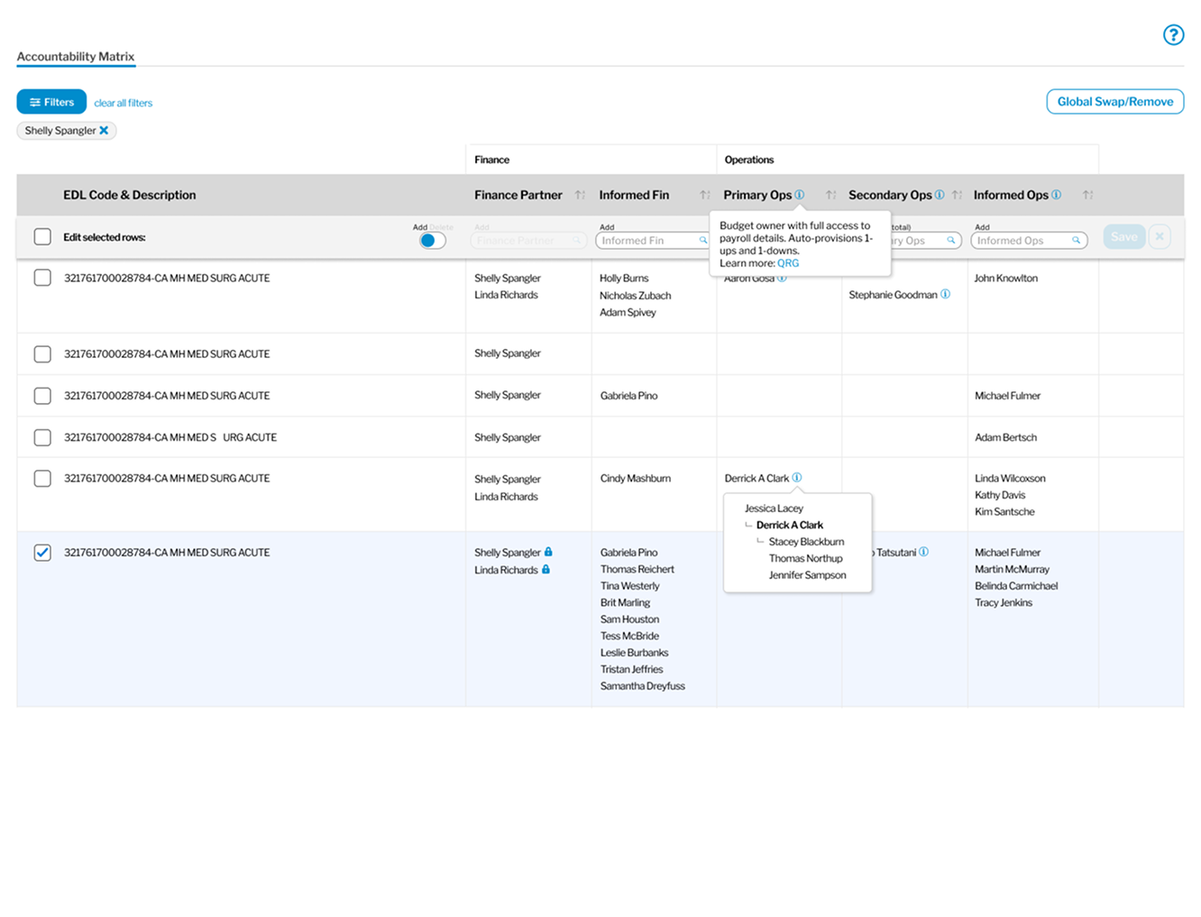 The Accountability Matrix centralizes assignment management, supports downstream data distribution (ValueLens, PowerBI, Tableau, etc.), and enables teams to accurately control reporting access and automate communications. I led the UX from wireframes to final Figma designs and collaborated with Providence stakeholders and an internal developer to bring the tool into production. Screenshots below show the tool’s evolution from initial data views to swap workflows to the editable grid interface.