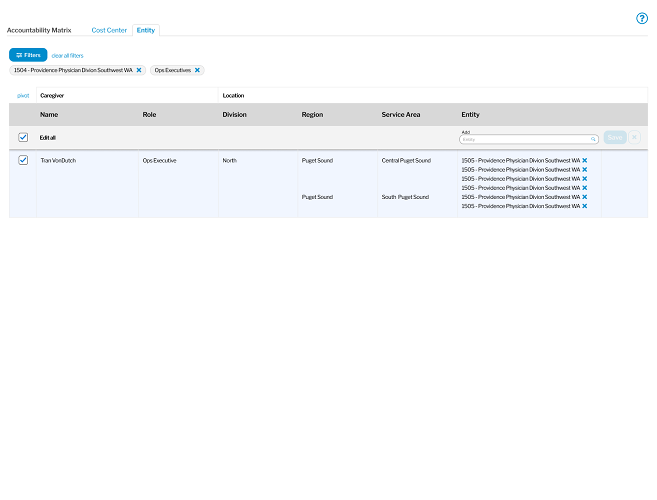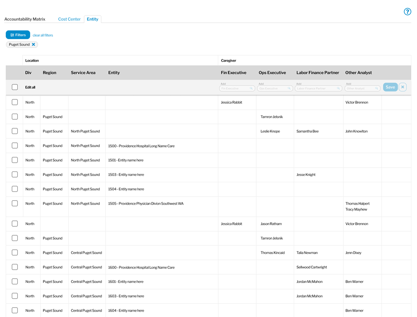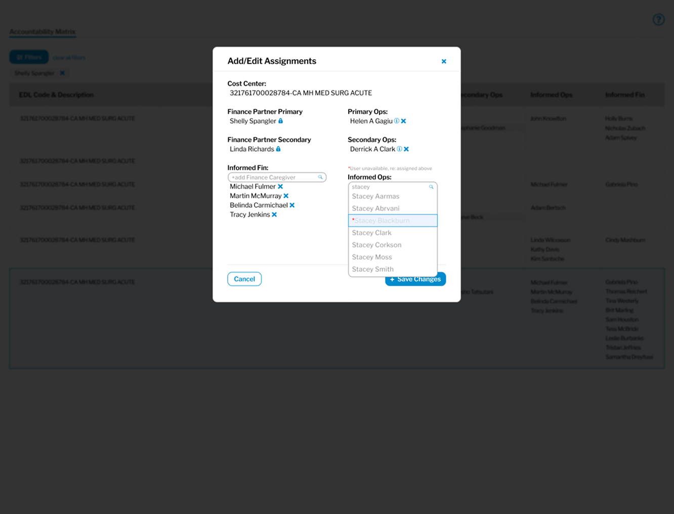 Providence Healthcare manages an enormous and complex financial ecosystem spanning thousands of departments, multiple regions, and a broad community of finance and operations users. Before this project, there was no standardized or reliable method for determining which financial caregivers were responsible for which departments resulting in fragmented spreadsheets, manual distribution lists, access inconsistencies, and gaps in critical reporting.I was brought in to design and build a new internal tool titled The Accountability Matrix using an existing BRD as the foundational reference. This tool provides a single system of record for assigning, maintaining, and governing caregiver responsibilities across Finance (Finance Partners, Informed Finance) and Operations (Primary Ops, Secondary Ops, and Informed Ops) roles.
