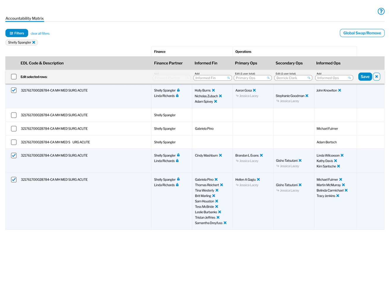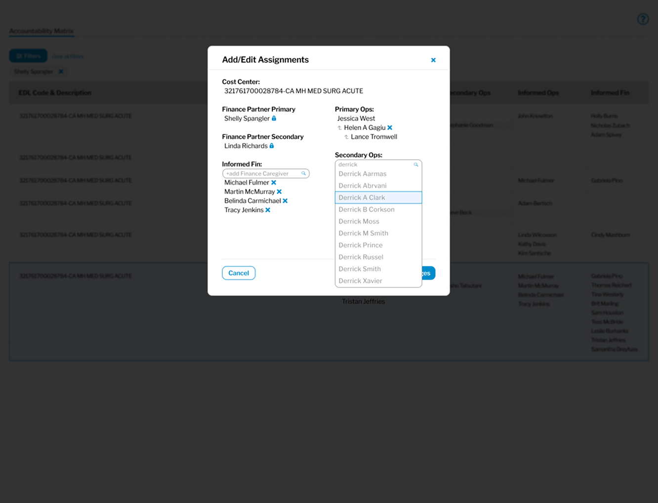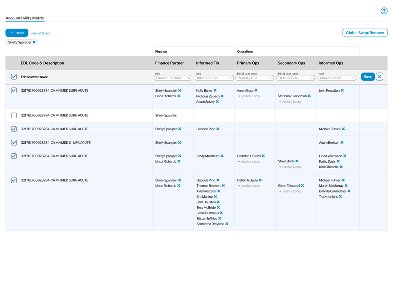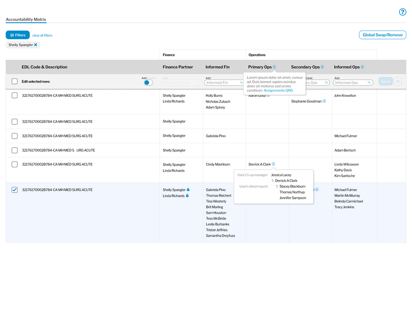 The Accountability Matrix centralizes assignment management, supports downstream data distribution (ValueLens, PowerBI, Tableau, etc.), and enables teams to accurately control reporting access and automate communications. I led the UX from wireframes to final Figma designs and collaborated with Providence stakeholders and an internal developer to bring the tool into production. Screenshots below show the tool’s evolution from initial data views to swap workflows to the editable grid interface.